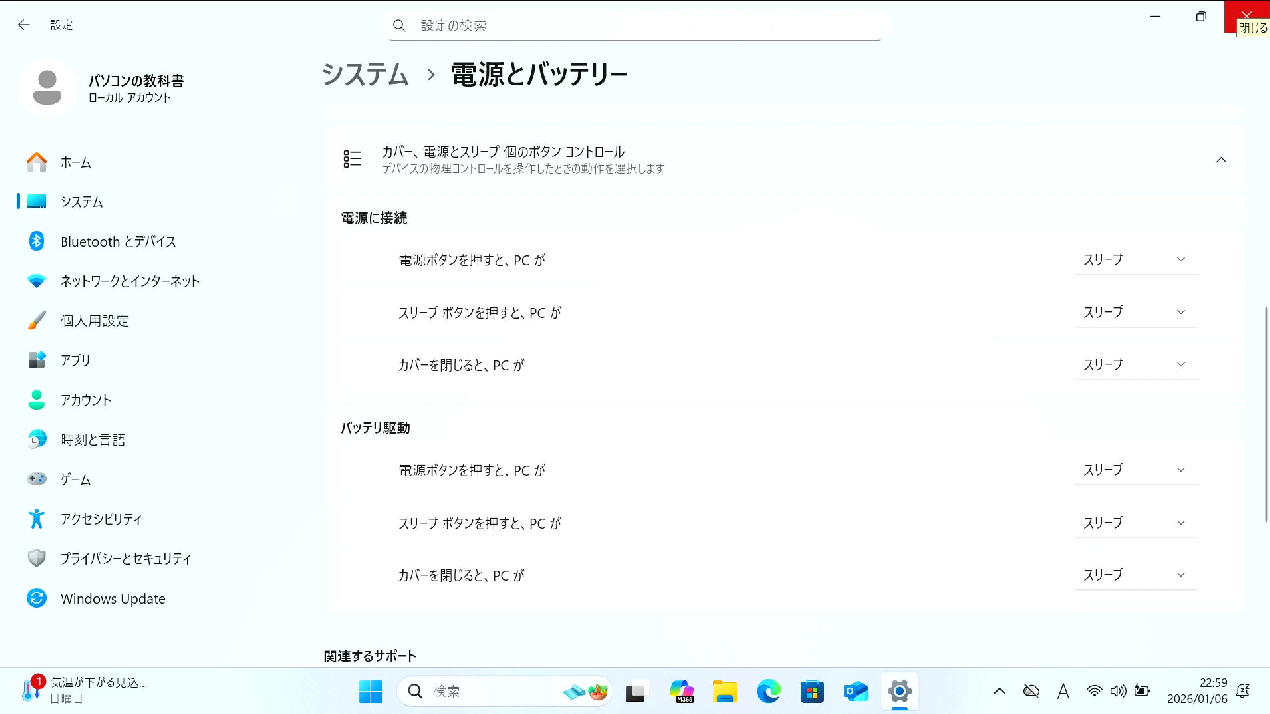 カバーを閉じたときの動作設定は、Windowsの設定アプリから電源オプション経由でアクセスします。