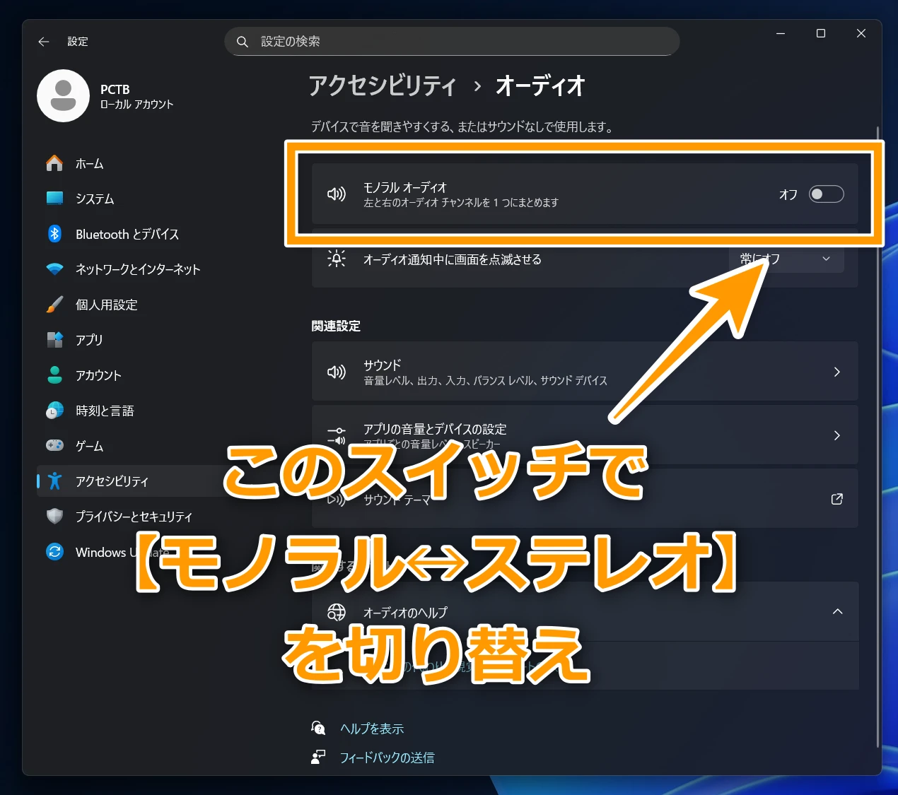 モノラルオーディオは、Windows11のアクセシビリティ設定から有効にできます。