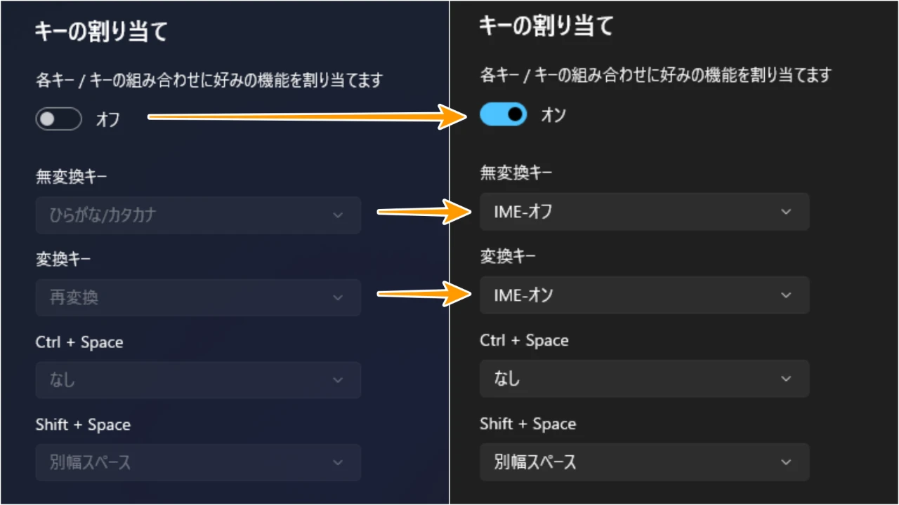 もし新しい操作に馴染めなければ、IME設定から元の割り当てに戻すことも簡単です。