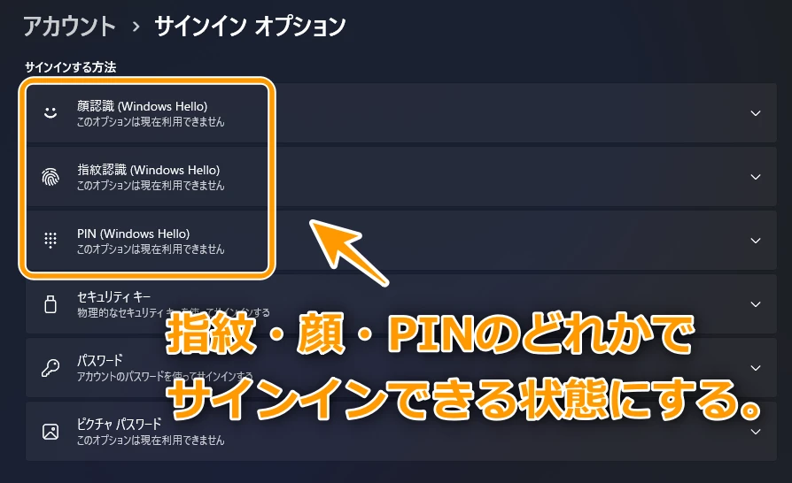Windows11でパスキーを使うには、まずWindows Helloの設定を完了させる必要があります。Windows Helloは、顔認証・指紋認証・PINコードのいずれかでWindowsにサインインできる機能で、パスキー認証の基盤となります。