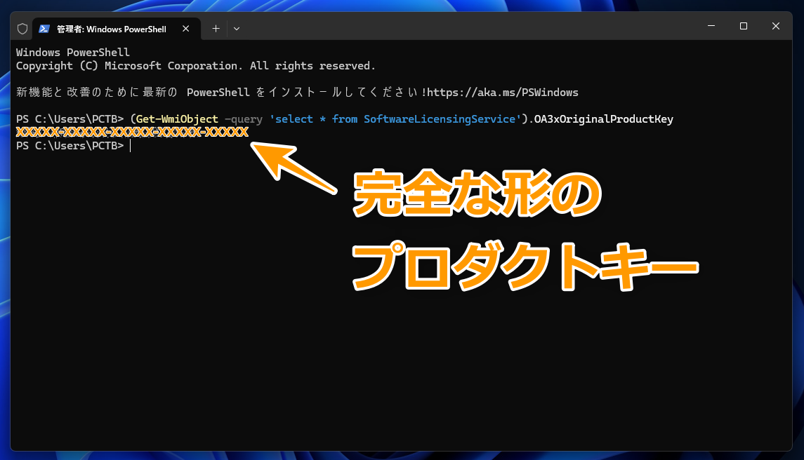 コマンドを実行すると、25桁のプロダクトキーが表示されます。「XXXXX-XXXXX-XXXXX-XXXXX-XXXXX」という形式で表示されるので、必要に応じてメモしておきましょう。
