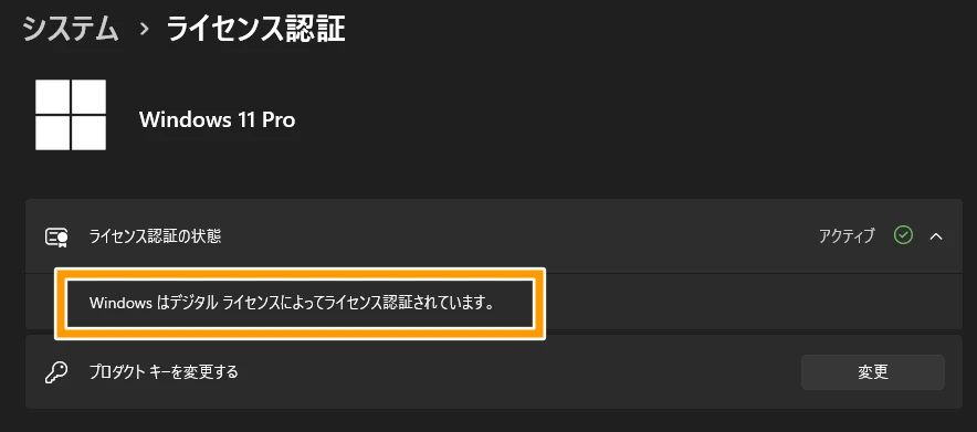 ↳ Microsoftアカウントまたはハードウェア情報に紐付けて認証 → プロダクトキーの入力が不要 - プロダクトキー認証