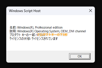 このコマンドを実行すると、「Windows Script Host」というダイアログが表示されます。ここには、Windowsのエディション(HomeやProなど)、ライセンスの状態、そしてプロダクトキーの下5桁が記載されています。