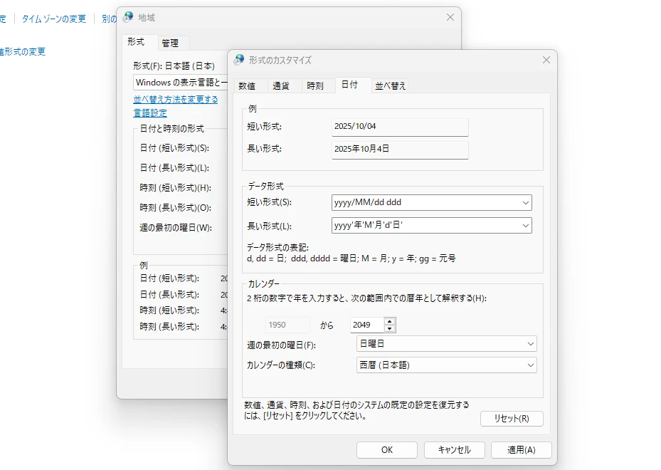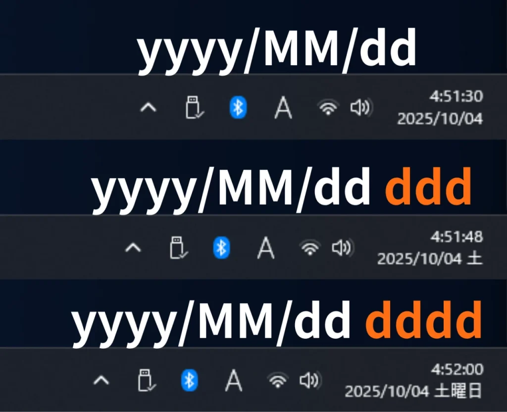 設定変更は「地域」設定から行います。日付の表示形式に `ddd`(曜日の略称)または `dddd`(フル表記)を加えることで、曜日が表示されるようになります。