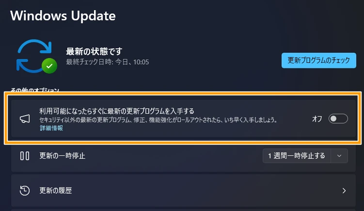 ただし、配信直後の更新プログラムはまれに不具合が見つかることもあるため、安定性を重視する場合はオフのままでも問題ありません。(Windowsの機能が増える!というようなものではありませんので、オンにしても実感を感じられるケースは少ないです。)